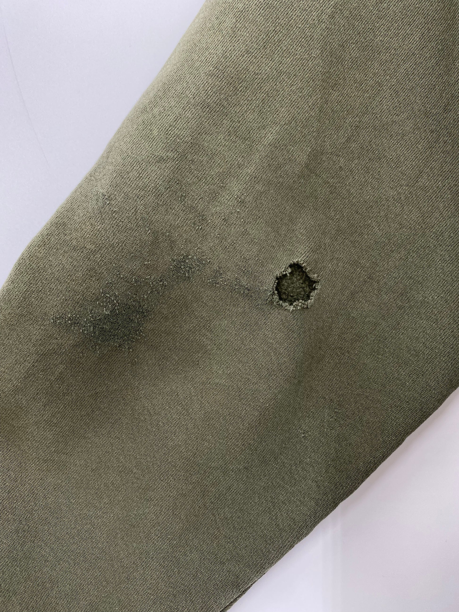 Condition : Faded color (front body), Stains (front body, sleeves) Small hole (left sleeve)